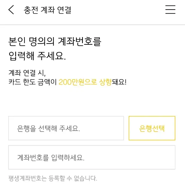 본인 명의의 계좌를 연결하시면 카드 한도 금액이 200만원으로 상향됩니다. 자동 충전 서비스를 이용할 수 있다는 장점도 있습니다.