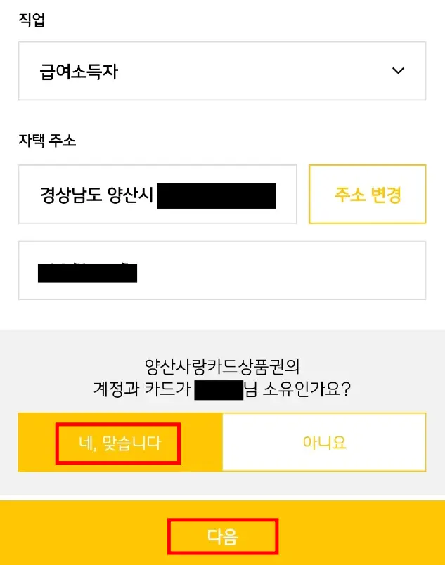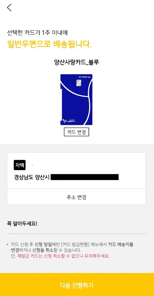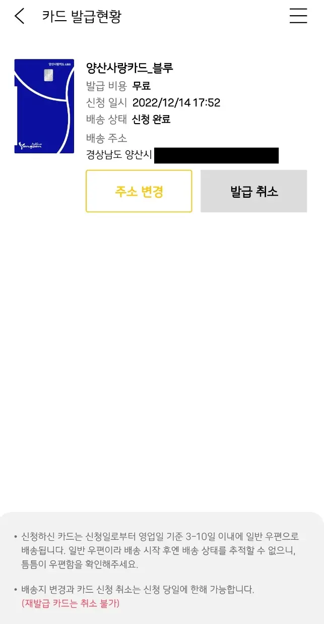 - 양산사랑카드 앱을 이용한 온라인 신청(약 일주일 소요)