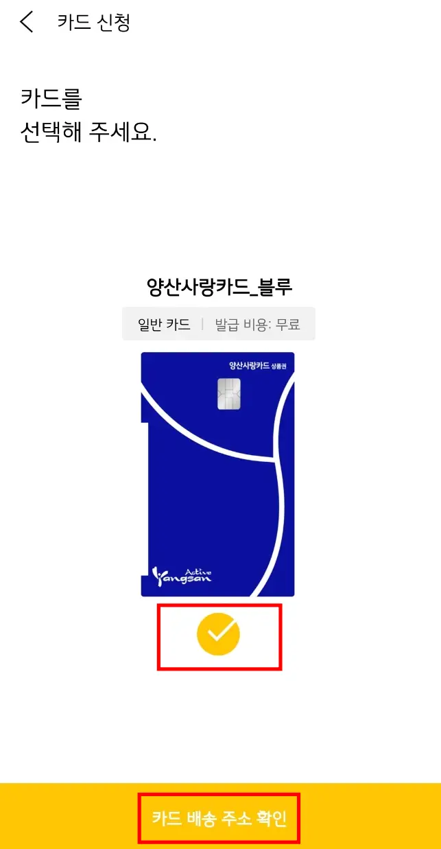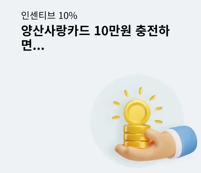 - 양산비즈니스센터 방문 : 신분증 지참, 양산사랑카드 앱을 미리 설치하면 빠르게 진행(즉시발급)