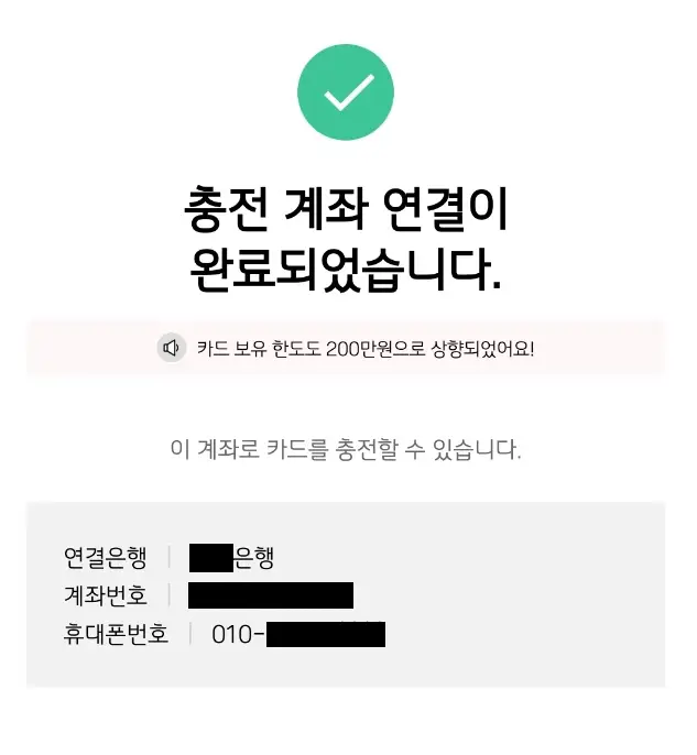 본인 명의의 계좌를 연결하시면 카드 한도 금액이 200만원으로 상향됩니다. 자동 충전 서비스를 이용할 수 있다는 장점도 있습니다.