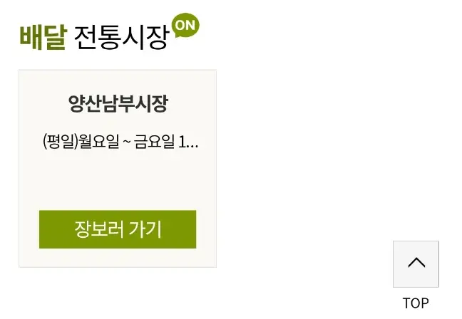 2022년 12월 8일부터 양산사랑카드 앱 내에서 양산 남부시장 장보기가 가능해졌습니다. 양산의 시장은 북부시장, 남부시장, 물금시장 등이 있지만 아직 양산사랑카드 장보기에 등록된 시장은 남부시장 한 곳 입니다. 배달 가능 시간은 오전 11시부터 오후 6시까지 입니다.
