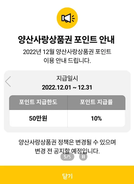 양산사랑카드는 충전 금액의 10%를 포인트로 추가 지급해주고 있습니다. 최대 월 50만원 충전시 월 최대 5만원의 인센티브, 최대 연 800만원 충전시 연 최대 80만원의 인센티브를 받을 수 있습니다. 충전 포인트 지급 기간은 2022년 12월 31일까지이며, 2023년 1월부터의 이벤트는 추후 발표될 예정입니다.