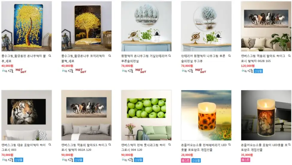 액자, 시계 등 벽장식 인테리어 소품이 많으며, 그 외에도 캔들, 크리스탈 장식, 조명, 주방 인테리어 용품도 많이 준비되어 있습니다.